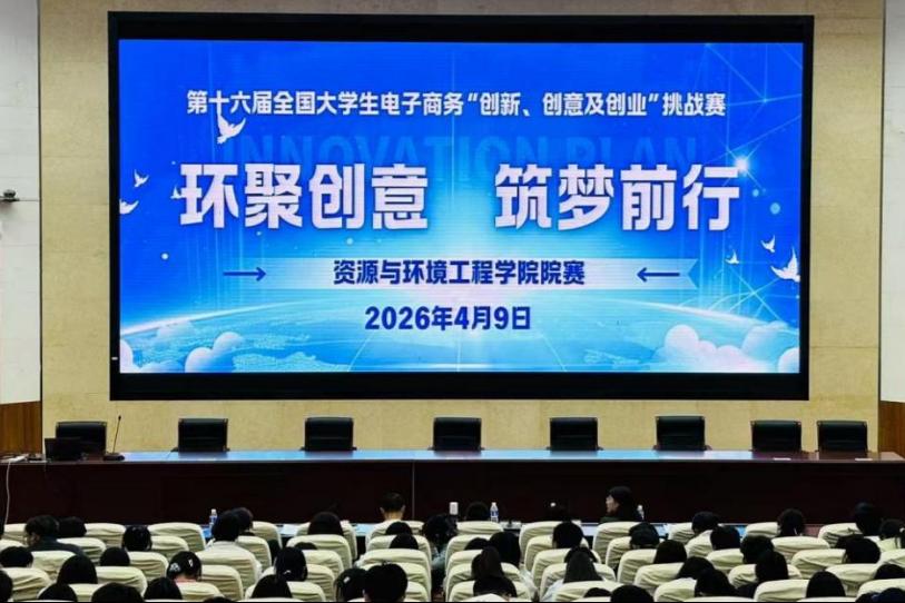 为深入推进创新创业教育,激发学生创新思维与创业热情,搭建实践能力展示与提升的平台,2026年4月9日19:00,第十六届全国大学生电子商务“创新、创意及创业”挑战赛暨资源与环境工程学院第三届院赛在二号报告厅隆重举行。