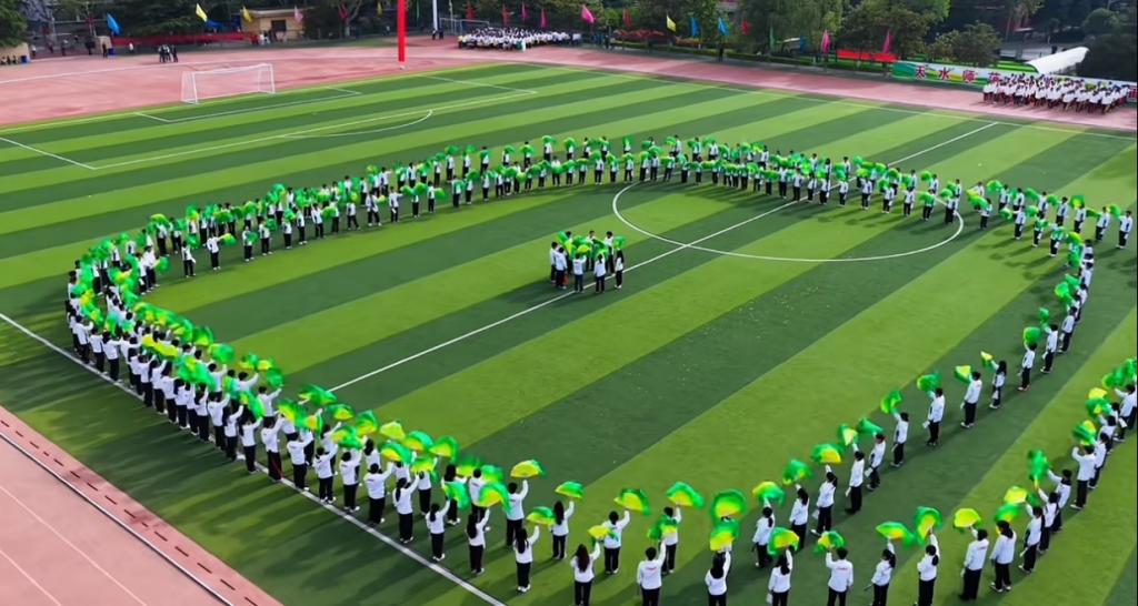 在表演过程中,队形变化层层推进、寓意鲜明。纵横交错的方阵勾勒出经纬交织的山河图景,展现了资源与环境工程学院学子立足专业、心系山河的责任意识;由队形汇聚而成的地球仪图案,象征着共同守护生态家园、建设美丽中国的坚定信念;山、水、圆、花等多种造型依次呈现,与轻快灵动的秧歌表演相互交织,生动表达了人与自然和谐共生的美好愿景;最终,队伍凝练拼成“我爱你,中国”字样和闪耀的五角星,将整场表演推向高潮,表达了青年学子对祖国最真挚、最炽热的情感告白。